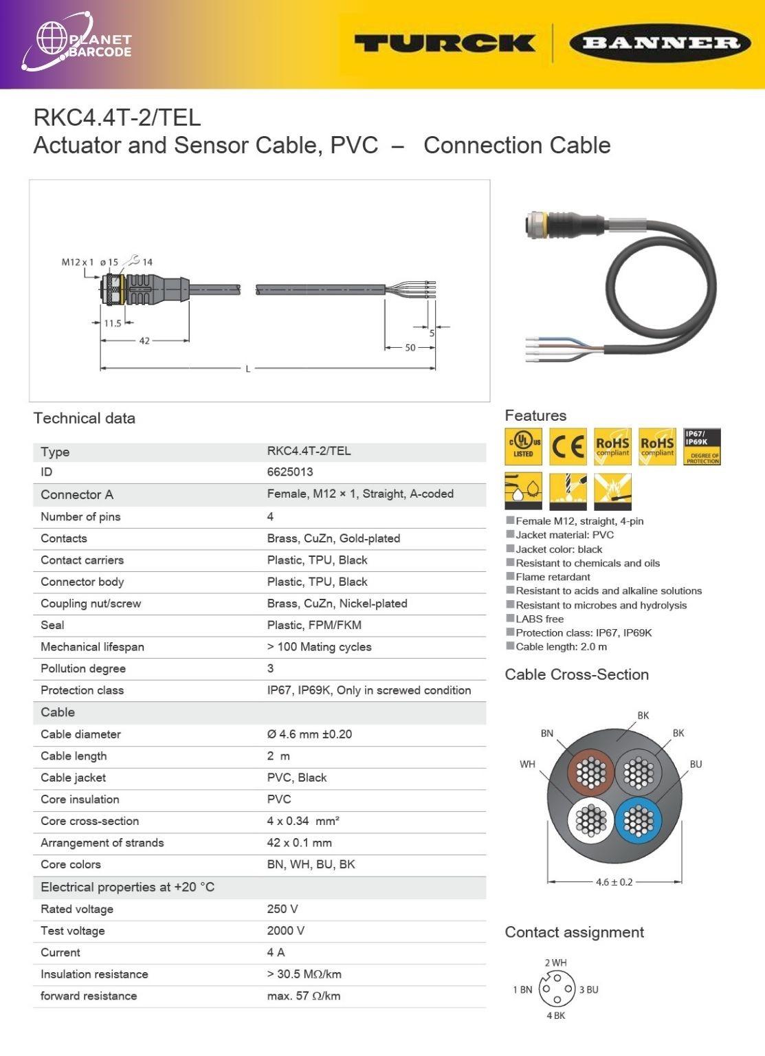 RKC4.4T-2/TEL จาก Turck Banner เป็นสายเซ็นเซอร์ (Cordset) แบบ Single-Ended สำหรับเชื่อมต่อเซ็นเซอร์ M12 ที่ออกแบบมาสำหรับงานอุตสาหกรรม มาพร้อมคุณสมบัติเด่นดังนี้: